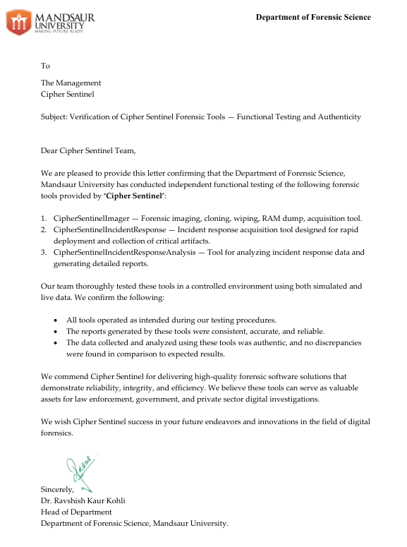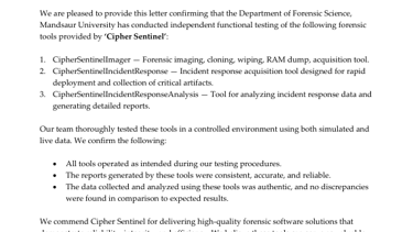 We are proud to share that Cipher Sentinel's forensic tools have undergone independent functional testing by the Department of Forensic Science, Mandsaur University. Following extensive evaluation, the university has verified the authenticity, accuracy, and reliability of the following tools: