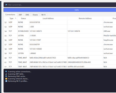 Monitor every TCP and UDP connection, including local and remote addresses, ports, and associated processes — ideal for detecting suspicious or hidden communications.ARP and DNS Cache Analysis