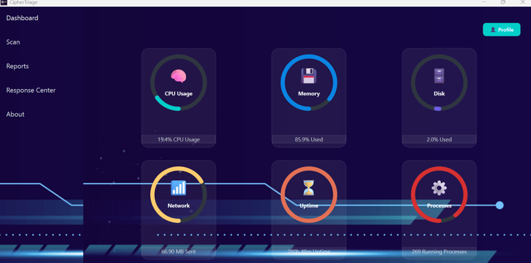 Welcome to the CipherTriage Dashboard — your command center for system diagnostics, incident response, and proactive monitoring. Designed with simplicity and speed in mind, our interface offers a crystal-clear snapshot of critical system metrics, including: