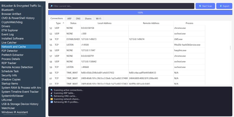 The Network and Cache module is your forensic-grade lens into live network activity and cached data. Designed for incident responders and threat hunters, this tool enables real-time inspection of: